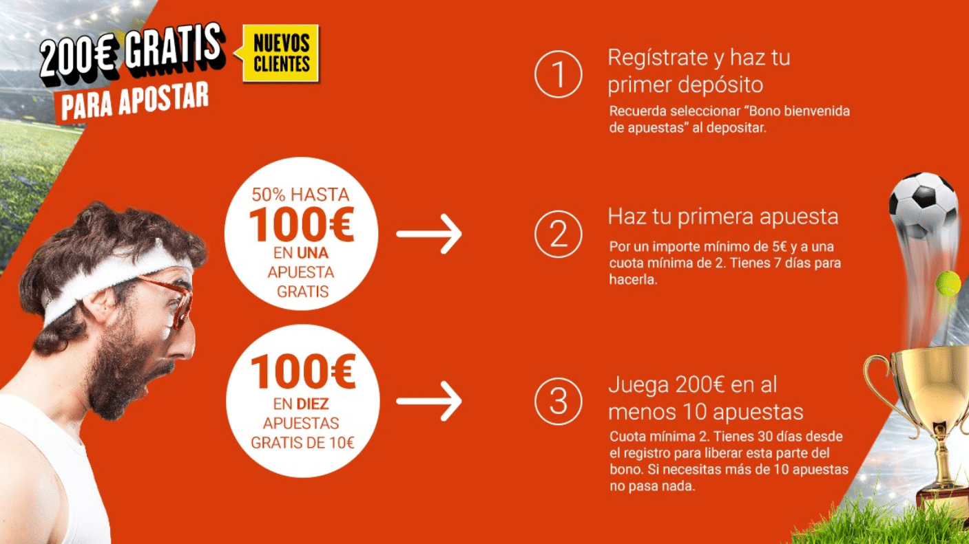- En lo que hace a las apuestas deportivas, hay una buena promoción de bienvenida. En este bono se puede recuperar el 50% de tu primera apuesta hasta los 100€. Además, también es posible que puedas conseguir 100€ en las siguientes apuestas que realices. Aparte de todas estas promociones de bienvenida, si realizas una combinada de al menos 3 eventos, vas a recibir 5€ gratis cada semana sin que importe si pierdes o ganas esta apuesta combinada. Así de fácil.